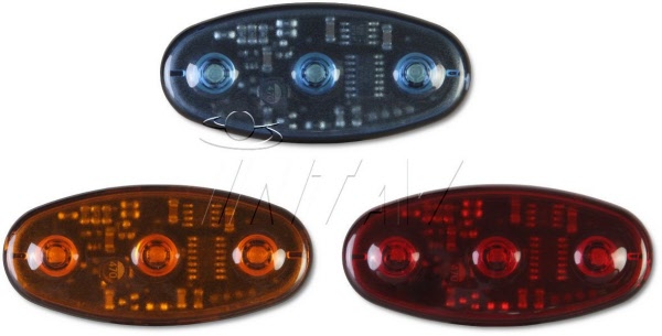 di forma ovale con 3 LED da 150mW. Multivoltage 12/24V. Installazionemediante biadesivo 3M permanente. Protetto contro l'inversione di polarità. IP66. Dimensioni lunghezza 63mm, altezza 29mm, profondità 10mm.